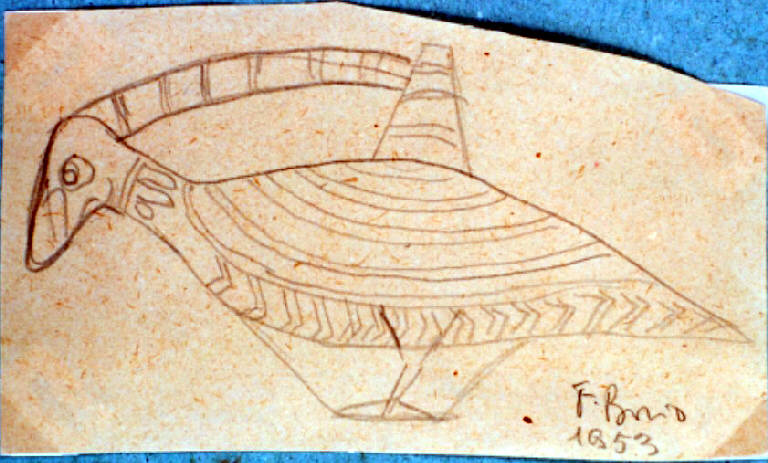 Disegno a matita di un progetto per una brocca a forma di uccello.