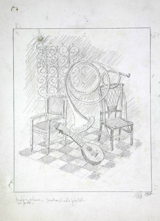 Composizione a matita di sedie e strumenti musicali.