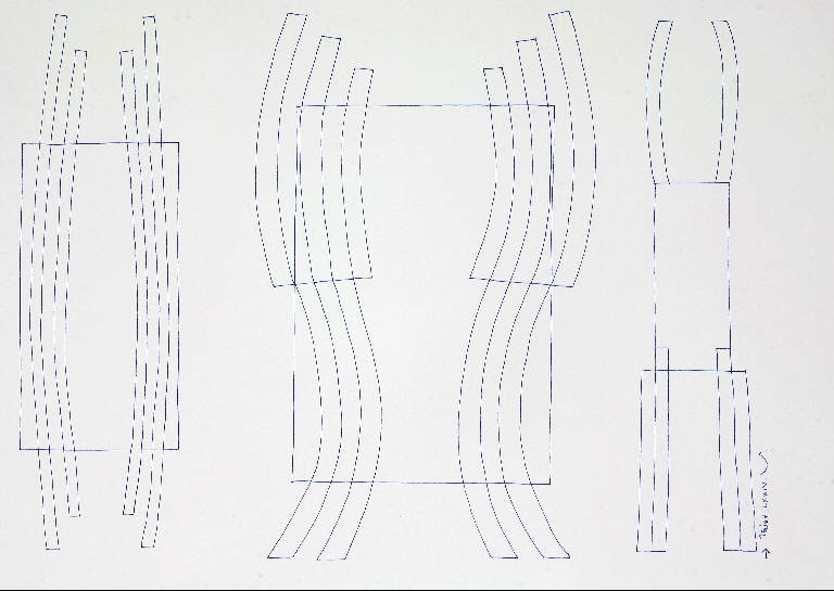 Composizione di forme astratte costituita da tre elementi che si sviluppano verticalmente. Quello al centro risulta di dimensioni maggiori.