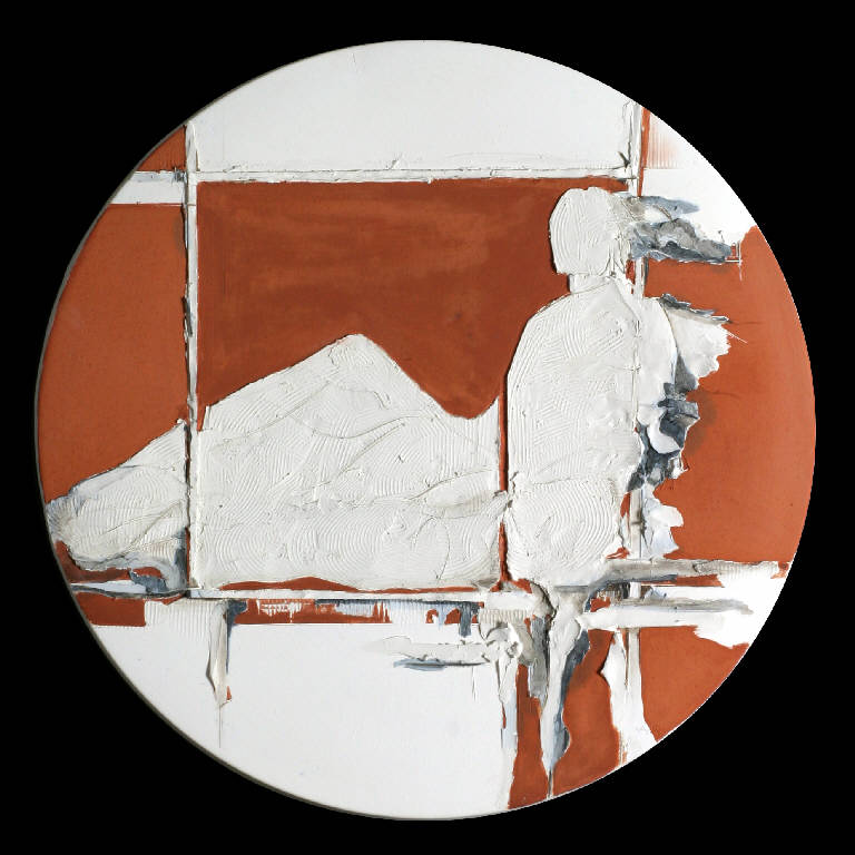 Opera di formato circolare in ceramica di colore bianco e marrone rappresentante una figura femminile seduta di profilo.