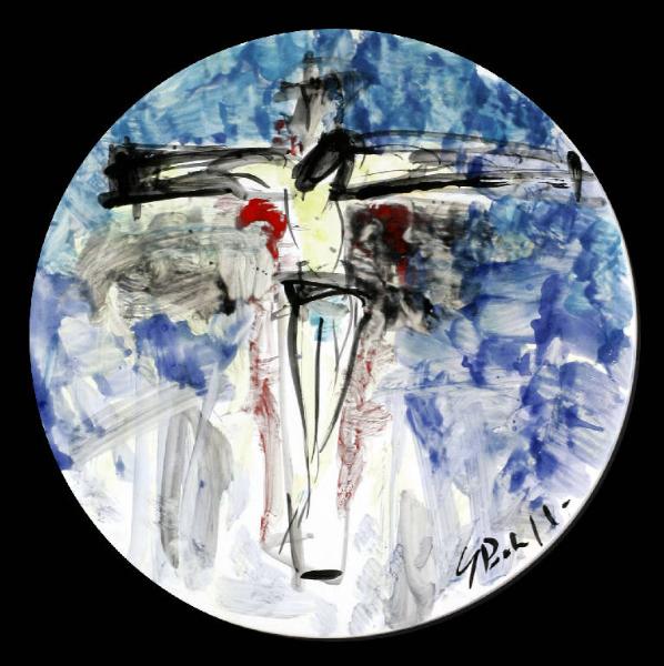 Opera di formato circolare in ceramica raffigurante Cristo in croce.