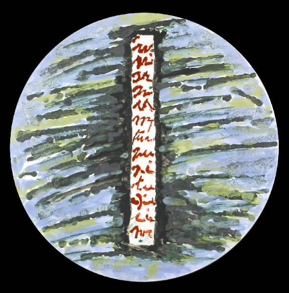 Opera di formato circolare in ceramica caratterizzata da un fondo azzurro con linee orizzontali verdi su cui si staglia al centro una banda verticale bianca con segni grafici rossi.