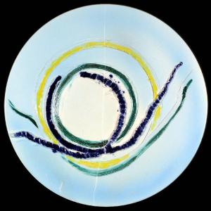 Opera di formato circolare in ceramica con forme curvilinee blu e segni circolari graffiti di colore verde e giallo.
