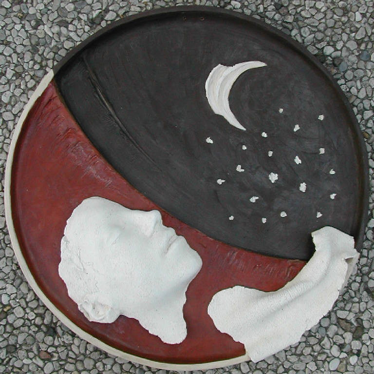 Opera di formato circolare in ceramica rivestita da uno strato di terracotta e decorata nella parte concava. La composizione è divisa obliquamente in due parti: la prima, di colore rosso mattone, presenta l'applicazione di un calco in gesso raffigurante un volto di profilo, la seconda, di colore scuro contiene la luna, in gesso , e le stelle, graffite.