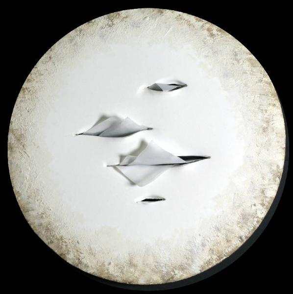Opera di formato circolare in ceramica policroma e gessata caratterizzata da tagli orizontali al centro della composizione nei quali sono inseriti elementi trasparenti in plexiglass.