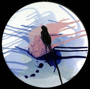 Opera di formato circolare in ceramica policroma caratterizzata dalla presenza su fondo bianco di colate di colore blu, nero e rosa che partono dal centro della composizione.