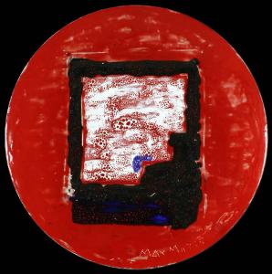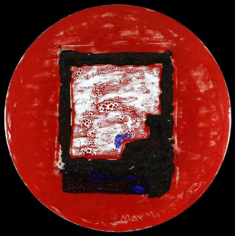 Opera di formato circolare in ceramica caratterizzata dal fondo rosso lucente sul quale si staglia al centro della composizione una figura geometrica irregolare bianca e rossa contornata da bordo nero quasi a creare una cornice.