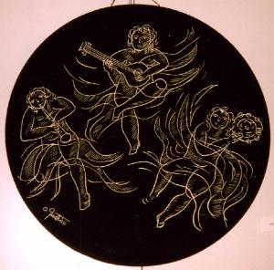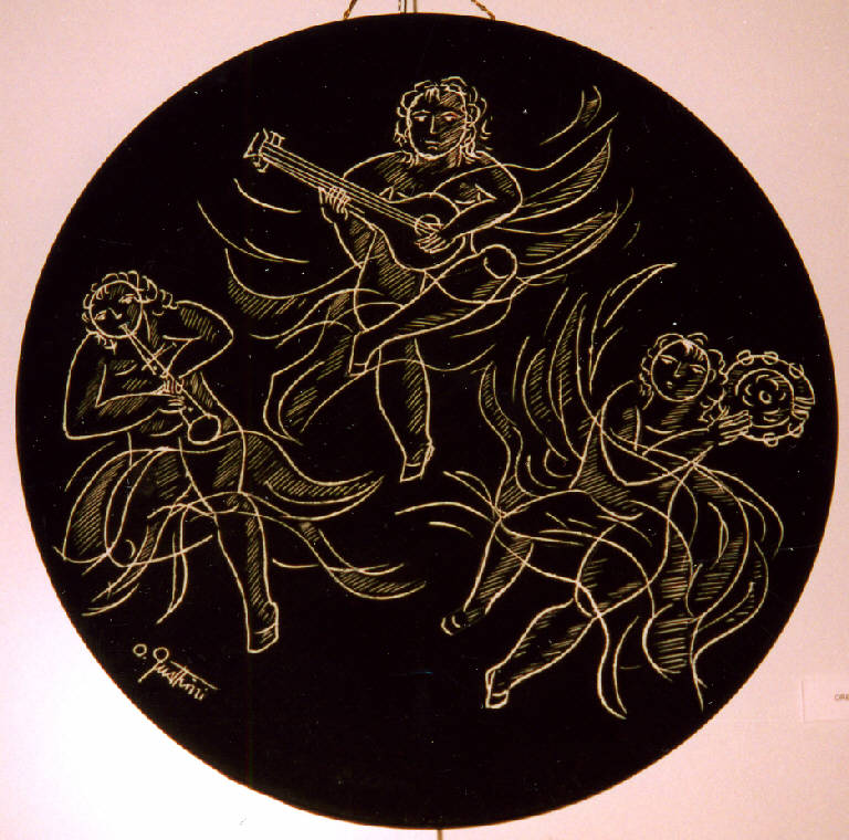 Opera di formato circolare in ceramica graffita che rappresenta su fondo nero tre puttini con strumenti musicali.