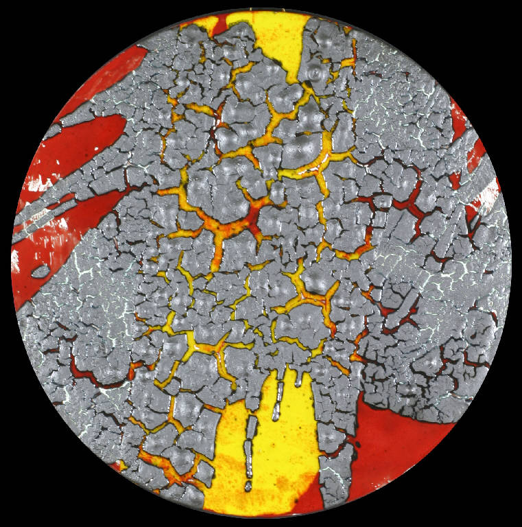 Opera di formato circolare in ceramica caratterizzata da un fondo nero e giallo smaltato sul quale è stato apposto un materiale ruvido e argentato che rende l'opera molto materica.