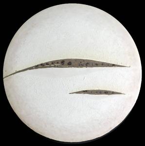 Opera di formato circolare in ceramica caratterizzata da un fondo chiaro sul quale spiccano due forme grigie sinuose e allungate disposte orizzontalmente.
