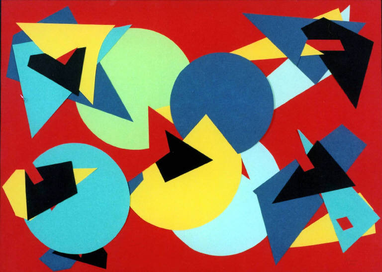 Opera costituita da forme geometriche in cartoncino colorato su fondo rosso, ritagliate e incastrate l'una nell'altra creando una composizione dinamica.