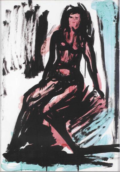 Opera pittorica che rappresenta una figura femminile nuda seduta. Il nudo è disegnato a tratti veloci e con marcati e spessi contorni neri. Il corpo della donna è di colore rosso e lo sfondo è nero e azzurro.