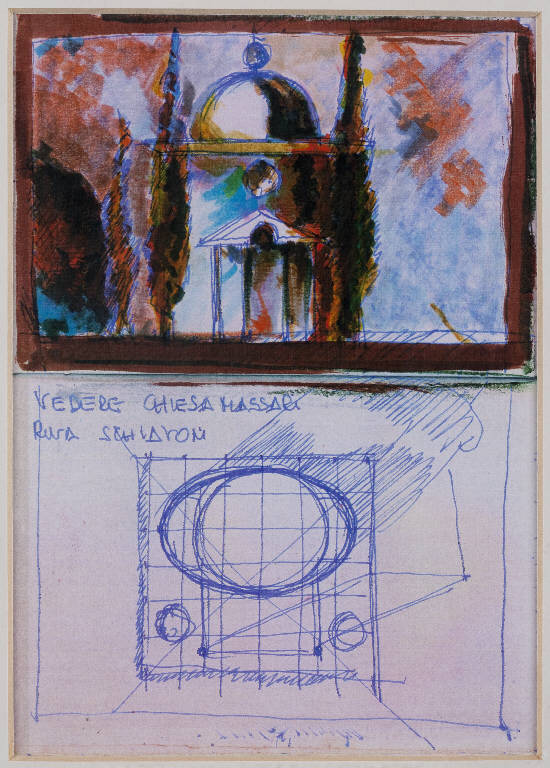 Disegno suddiviso orizzontalmente in due parti. Nella parte alta vi è lo schizzo di un tempietto classico con cupola semisferica. Lo schizzo è molto colorato con colori scuri e toni d'azzurro. Il tempio è preceduto da un ingresso sorretto da quattro colonne lisce che a loro volta sorreggono una trabeazione e un timpano rettangolare. La cupola è semisferica e liscia.\nNella parte inferiore del disegno è invece rappresentata la pianta del tempio con inchiostro blu.