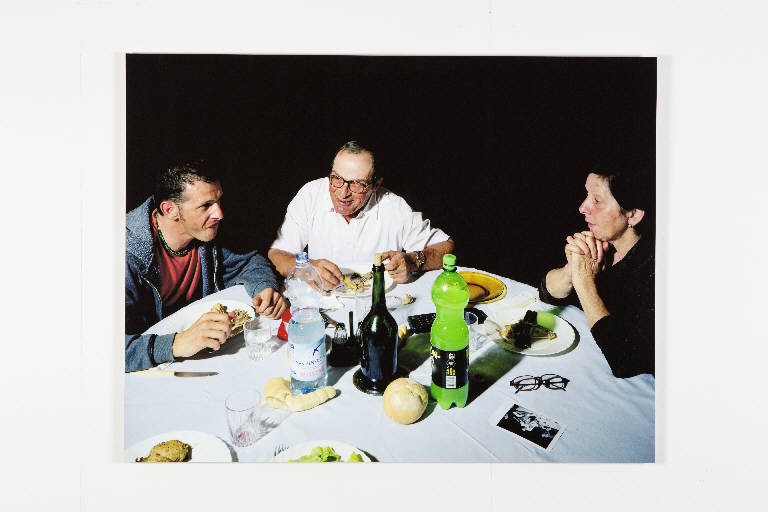 Ghe' pronto! è un progetto che analizza il momento del pasto all'interno della famiglia italiana infatti la serie presenta cinque scene di gente comune mentre condivide il pasto a tavola. Questa fotografia rappresenta una famiglia a tavola: mamma, papà e un figlio. Le persone sono riprese intente a mangiare e non guardano l'obiettivo. Le figure emergono da un fondo nero. Nell'angolo in basso a sinistra c'è un posto apparecchiato per una persona: il fotografo.