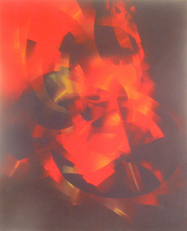 Composizione sui toni del rosso e del bordeaux. Nastri di colore si avvolgono su se stessi a formare dei vortici. Sfondo scuro nella parte destra e in quella inferiore dell'opera.