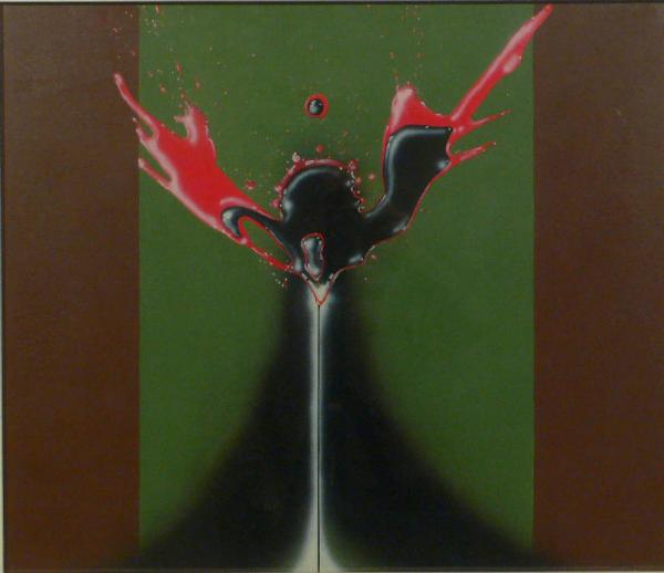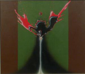 La figura centrale della composizione è una macchia a forma di uccello o pipistrello di colore rosso e nero, dal cui ipotetico becco o bocca parte una linea nera che taglia a metà la parte inferiore del quadro. Lo sfondo è suddiviso in tre fasce verticali, verde al centro e marrone ai lati. Dal basso verso il centro salgono due parabole ascendenti nere, divise al centro da una striscia bianca.