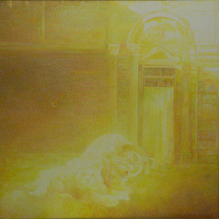In primo piano sono ritratti due leoni accovacciati, la leonessa è rivolta verso lo spettatore, mentre il leone alle sue spalle ruggisce. Parzialmente coperti da un telo chiaro appoggiato ad una ruota i due felini sono accucciati davanti ad un edificio di cui si nota il grande portone istoriato anch'esso coperto da un telo bianco con di fianco due semi colonne con capitelli sormontate da un arco a tutto sesto.