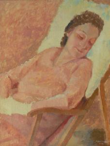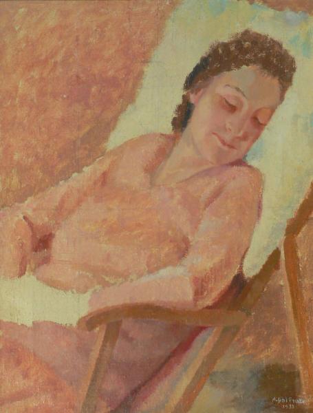 Ritratto di giovane donna distesa su di una sedia che dorme. La donna ha capelli castani raccolti, il viso poggiato ad un cuscino, gli occhi sono chiusi con ombre che ne segnano le occhiaie; le braccia sono poggiate sui braccioli della sedia; indossa un abito lungo rosa. L'opera non è finita, mancato, infatti, i dettagli delle mani congiunte sul ventre.