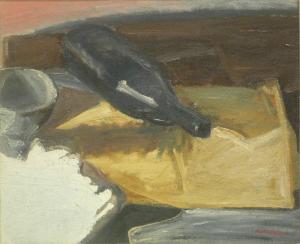 Natura morta con bottiglia nero-fumo con riflesso luminoso e scodella nelle sfumature del grigio. I colori dominanti sono il nero, il grigio fumo, l'ocra e il marrone. Unica zona in evidenza è la campitura bianca in basso a sinistra.
