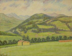 Paesaggio montano nei toni del verde. Sullo sfondo montagne nelle tonalità dell'azzurro e del viola e cielo con sfumature di azzurro e viola. Sulla montagna al centro dell'opera filari di alberi definiscono i contorni di campiture verde chiaro. In primo piano leggermente spostate a sinistra due case gialle con tetto rossastro, mentre a destra vi è uno steccato.