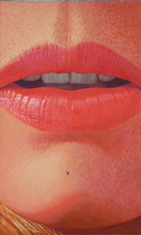 Dettaglio di viso femminile raffigurante una bocca semiaperta con una mosca appoggiata sul mento