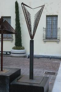Struttura composta da due elementi sovrapposti. Un elemento rettangolare allungato funge da sostegno per un secondo elemento dalla forma trinagolare con vertice in basso, nel punto di congiungimento dei due. La parte sovrastante è costituita da una struttura esterna di ferro dalla quale partono dei raggi diagonali verso l'interno.