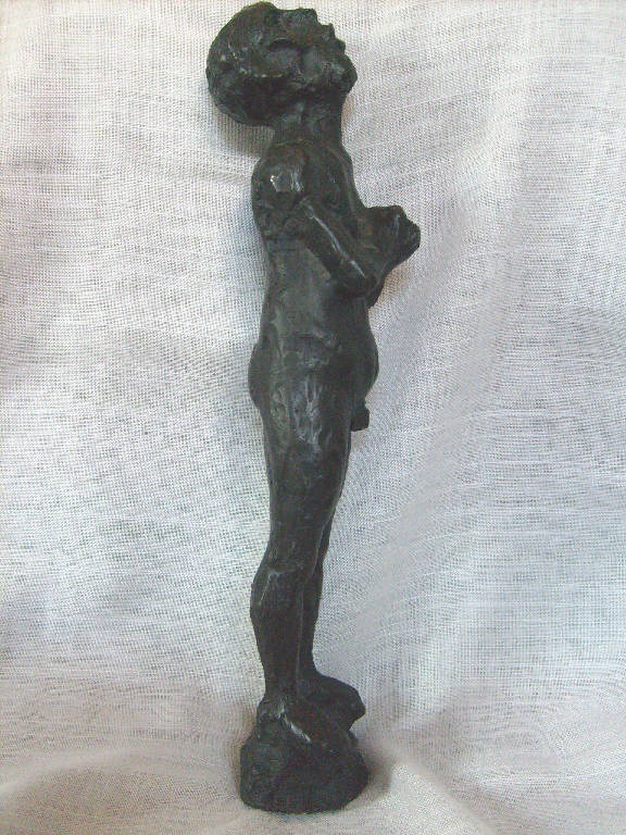 Figura maschile in posizione eretta. Le mani sono giunte al petto e lo sguardo è rivolto in alto.