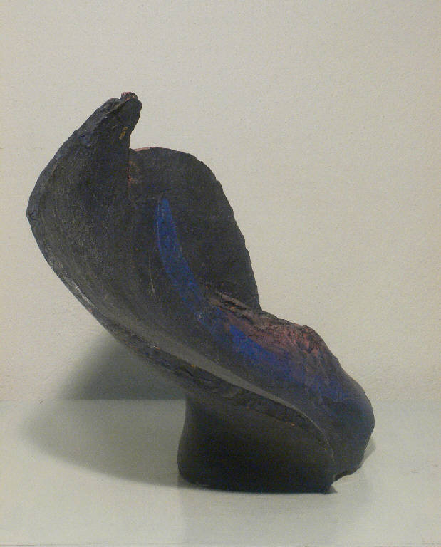 Scultura sviluppata lungo un asse diagonale. presenti tracce di colore rosa e blu.