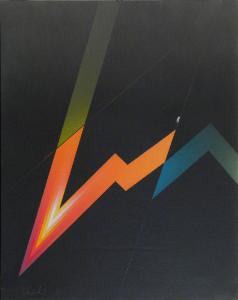 Su sfondo nero un lampo di tutti i colori dell'arcobaleno. Su di una linea diagonale una scritta "arcobaleno", su una seconda linea diagonale la scritta "cielo"