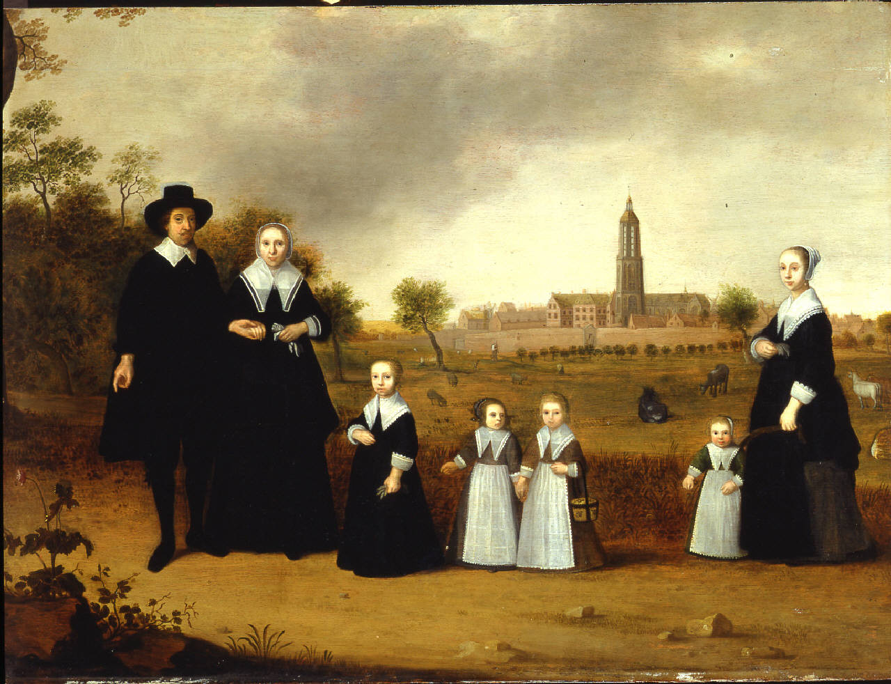 - NOTIZIE STORICO CRITICHE Tradizionalmente attribuito a Adam Willaerts (eccetto Hoogewerff [1922] che lo assegna alla maniera di Albert Cuyp), il dipinto è in realtà riconducibile alla mano del figlio, Cornelis Willaerts, come conferma la forte analogia stilistica con il "Gruppo di famiglia su una spiaggia", firmato dall'artista e datato 1649 (Kent, collezione privata; foto RKD), e con il "Gruppo di famiglia" del 1645, passato sul mercato antiquario come Adam Willaerts (Amsterdam, Sotheby's/Mak van Waay, 15 novembre 1983, n. 72). Il nostro quadro, visti lo stile e i costumi, è databile allo stesso periodo circa, cioè intorno al 1650. Il capofamiglia indica una pianta in fiore nell'angolo in basso a sinistra; si tratta di una papaveracea, il cui fiore, nel XVII secolo era posto in relazione con la fertilità, qui testimoniata dalla prole ritratta con i genitori. La città nello sfondo può essere identificata in Rhenen, nel Gelderland, a sud-ovest di Utrecht. Si notano tra l'altro la torre della chiesa di S. Cunera con accanto il palazzo del re Federico di Boemia.
