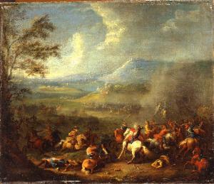 - NOTIZIE STORICO CRITICHE Nonostante la firma "f.v.breda" riportata sul retro della tela, il dipinto e il suo pendant sono stati attribuiti da Rosa (1966) a Carel Breydel. L'attribuzione a Jan Frans van Bredael è invece indiscutibile anche sul piano stilistico, come conferma il confronto con altre battaglie dell'artista (cfr. Jursz 1982, p. 31, nn. 14, 15). Jan Frans e il cugino Jan Peter sono i più noti rampolli di una vasta progenie di pittori di Anversa. Jan Frans era principalmente pittore di paesaggi alla maniera di Jan Brueghel, ma talvolta si dedicava al genere delle "battaglie equestri", in cui era specializzato il cugino.