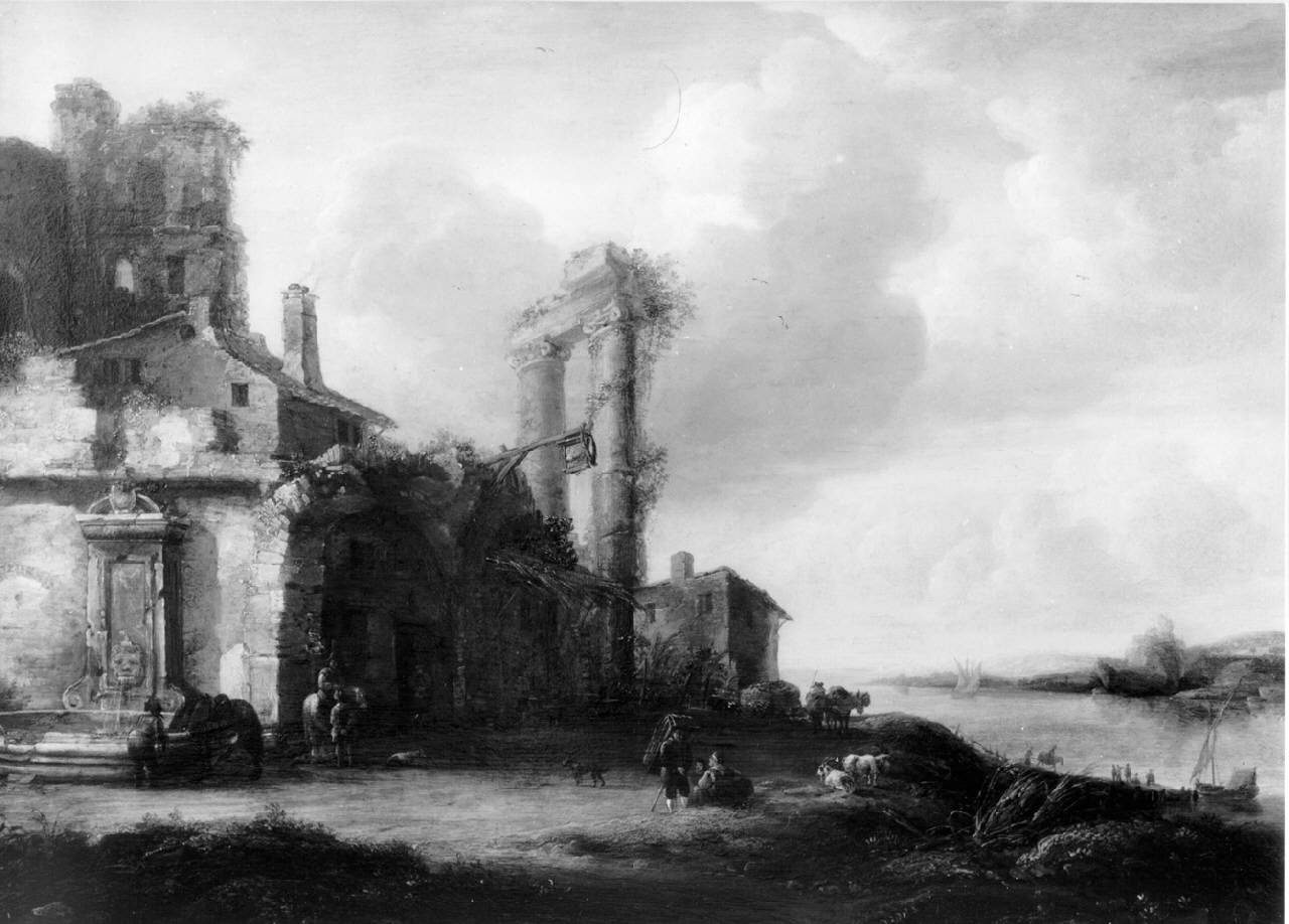 - NOTIZIE STORICO CRITICHE Oltre a vedute cittadine topograficamente esatte, Beerstraten deve la sua fama a un gran numero di paesaggi invernali raffigurati con ottima resa di luce e atmosfera. Ma il suo repertorio annovera anche marine, vedute sulla spiaggia e paesaggi in stile più o meno italianeggiante, sebbene l'artista non soggiornò mai nella Penisola. Tali vedute, come questa, dai caratteristici motivi italiani - le rovine antiche e la morfologia del paesaggio - furono probabilmente composte in studio, ad Amsterdam, sulla base di raffigurazioni di altri artisti. D'altro canto, la non diretta esperienza italiana, emerge dal tipo di luce che, come nel dipinto del Castello, è più nordica che meridionale.