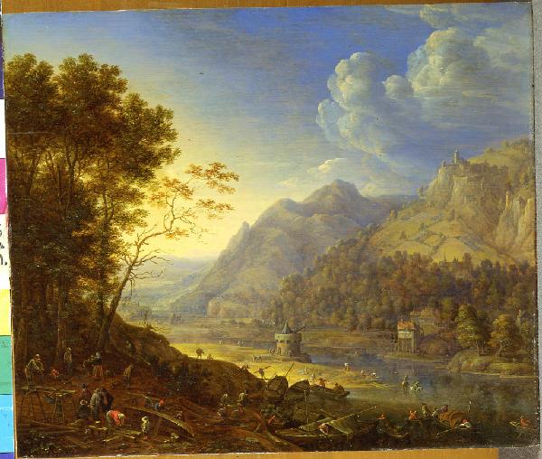 - NOTIZIE STORICO CRITICHE Buona parte della produzione di Herman Saftleven della seconda metà del Seicento è costituita da vedute di fantasia delle vallate del basso Reno e della Mosella, con montagne e un gran numero di piccole figure e un punto di vista alto e panoramico. Dopo la pace di Munster (1648), numerosi pittori olandesi viaggiarono in quella zona e vi eseguirono disegni topografici. Il dipinto del Castello stringe forti affinità stilistiche con i paesaggi che dell'artista si conservano a Klosterneuburg, Kremsier e in collezioni private (cfr. Schulz 1982, nn. 209, 210, 231, tavv. 54, 55, 58).