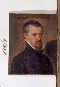 - NOTIZIE STORICO CRITICHE L'indicazione a Tiziano nell'iscrizione che compare sul retro, su cartellino, non è attendibile. La miniatura infatti non presenta alcun rapporto stretto con la ritrattistica veneta del Seicento, e un'affinità andrebbe semmai individuata più nella direzione di Tintoretto che di Tiziano. Forse il dipinto è una copia in scala ridotta da un presunto ritratto del maestro cadorino o un'opera d'invenzione. La pratica di realizzare copie in miniatura di quadri ritenuti importanti, in ogni caso si afferma e si diffonde soprattutto dopo la metà del Seicento. L'opera proviene dalla collezione Bolognini e alla fine dell'Ottocento (1895), secondo una pratica ricorrente per l'esposizione delle "miniature" o dei dipinti di piccole dimensioni, l'opera venne sistemata all'interno di un "passe-partout" insieme agli inv. 135/2-135/11.