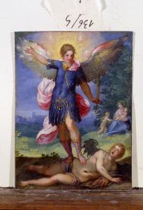 L'Arcangelo Michele calpesta il demonio, sullo sfondo Maria, il Bambino Gesù e San Giovanni Battista. San Michele Arcangelo Combatte Contro Satana