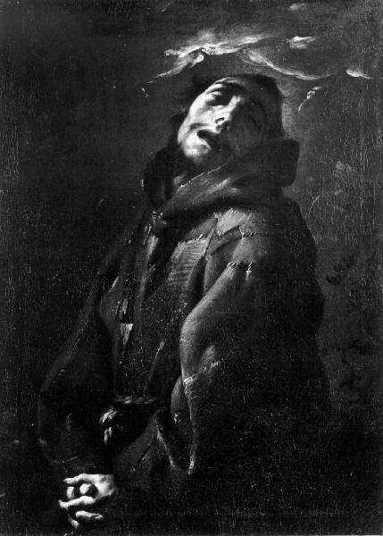 - NOTIZIE STORICO CRITICHE Donata nel 1905 alle Civiche Raccolte d'Arte da Giovanni Frova come tela del Cerano, l'opera venne successivamente riferita al Morazzone. L'opera è stata inoltre messa in relazione con l'attività milanese di Alessandro Magnasco. Il nome di Cairo viene fatto in termini dubitativi, per la prima volta, in occasione della mostra sull'arte lombarda tenutasi a Zurigo nel 1948, sulla base dei rapporti con il "Cristo dell'orto" nella Collezione Sabauda di Torino. La letteratura successiva è generalmente concorde con l'attribuzione a Francesco Cairo e nel proporre una datazione ai primi tempi di attività del pittore, tra la fine degli anni venti e i primi anni trenta del Seicento. Il dipinto presenta una stesura di grande intensità, giocata sulle impercettibili variazioni dei toni bruni che dal fondo si estendono sul saio rappezzato e sugli incarnati del santo, dando vita ad un'immagine quasi monocroma, ravvivata da vibranti riverberi di luce che colpiscono le mani annodate, il volto emaciato di Francesco e le nuvole che lo circondano. Lo sguardo è interamente incentrato sullo spasimo del santo determinando un'altissima tensione drammatica, propria dell'attività giovanile del Cairo. Le evidenti suggestioni del Cerano e del Morazzone appaiono tradotte in un linguaggio autonomo con l'eliminazione di ogni orpello narrativo e descrittivo che sembra tradire una profonda sintonia con gli esiti della letteratura mistica tardo-cinquecentesca e seicentesca, in particolare con i racconti di Santa Teresa d'Avila favorita dai cotanti rapporti con la committenza carmelitana. Sono inoltre da evidenziare le sostanziali corrispondenze che legano il dipinto alla pala raffigurante lo "Svenimento del Beato Andrea Avellino", Milano, Sant'Antonio abate. (Frangi, 1998)