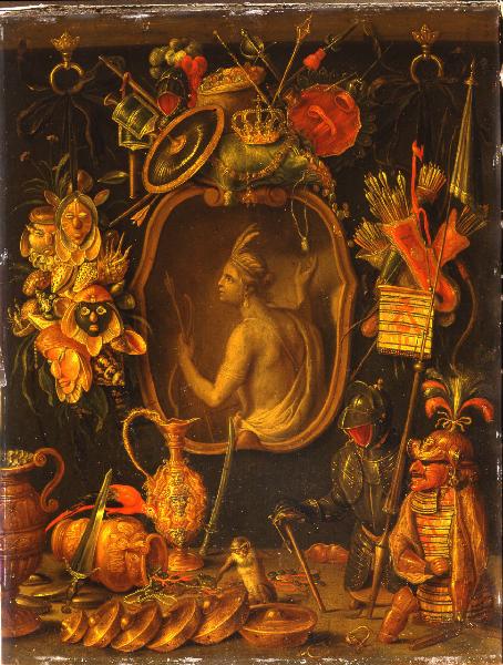 - NOTIZIE STORICO CRITICHE Questo rame raffigurante l'"Allegoria dell'America" e il suo pendant con l'"Allegoria dell'Asia" (inv. 760) sono significativa testimonianza della collaborazione tra Erasmus Quellinus II e Jan van Kessel I che ebbe luogo a partire dalla metà del settimo decennio del XVII secolo, momento in cui si datano altre opere innovative e virtuosistiche dei due pittori anversesi, come la serie di originalissimi dipinti su rame raffiguranti i "Quattro Continenti", oggi a Monaco (Alte Pinakothek; inv. nn. 1910-1913). Iconograficamente i due dipinti milanesi sono costruiti secondo un modello prossimo a quello proposto dai "thesauri exoticorum" letterari, ovvero attraverso il ricorso ad "allusioni figurate" alla produzione artistica, alle manifatture locali, ai corredi militari tipici del continente che si rappresenta. L'America viene qui raffigurata attraverso una personificazione in monocromo posta all'interno di una cornice modanata (da attribuirsi a Erasmus Quellinus II, pittore di figure): una figura femminile seminuda armata di faretra e frecce. Intorno alla personificazione vengono rappresentati oggetti di varia natura riferibili al governo del continente e alle sue attività civili, religiose e militari. Le due opere del Castello facevano parte di una serie completa dei Quattro Continenti comprendente anche l'"Allegoria dell'Europa" e l'"Allegoria dell'Africa". E' ipotizzabile che uno dei rami smembrati della serie possa riconoscersi nella cosiddetta "Vergine contornata da simboli di Vanitas" di collezione privata belga (foto Londra, Witt Library), da leggersi in realtà come "Allegoria dell'Europa" (personificata nella Chiesa di cui Maria Vergine è regina). Qualora l'ipotesi fosse corretta si avrebbe un ulteriore elemento riguardo alla circostanza di committenza del prezioso insieme smembrato: nell'"Allegoria dell'Europa" sopra menzionata infatti, sotto al cartiglio recante il nome di Alessandro VII, un foglietto con l'iscrizione "Martino Ambrosio Capello" - che fu vescovo di Anversa nel periodo in cui i dipinti vennero realizzati - fornirebbe il nome del possibile committente dei quattro rami. La datazione delle due opere del Castello si desume dall'iscrizione posta sull'"Allegora dell'Asia", che reca anche la firma dei due artisti.