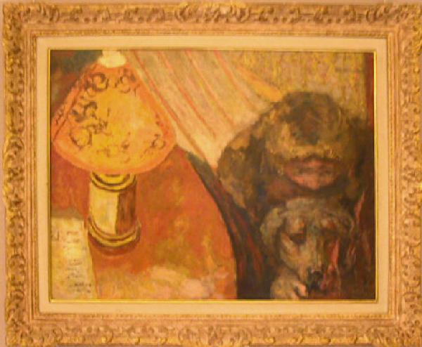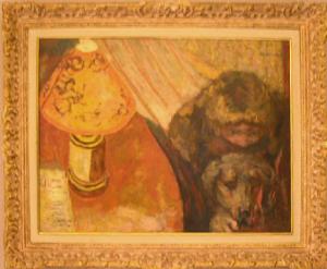 Interno (Alla luce della lampada). interno di stanza con figura e animale domestico