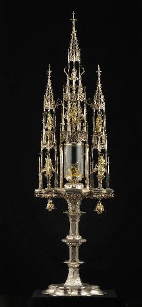 Questo imponente ostensorio architettonico in argento poggia su un alto piedistallo formato da un piede lobato e dal fusto a sezione poligonale suddiviso da tre nodi schiacciati, anch'essi poligonali. Superiormente, su una base mistilinea, poggia un'alta guglia traforata a motivi vegetali ospitante la teca in cristallo per l'eucarestia con lunetta sorretta da due piccoli angeli e due sculture in argento dorato, una della "Madonna assunta" e l'altra più piccola dell' "Ecce homo" (Schmerzensmann). Ai lati, entro due guglie minori, sono collocate le statuette in argento dorato di "San Pietro" e "San Paolo" nella parte bassa e quelle di "San Sebastiano" e "San Rocco" in alto. Coronano le guglie tre alti pinnacoli traforati e decorati a piccoli motivi.