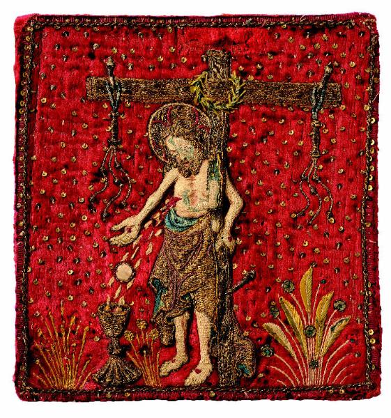 - NOTIZIE STORICO CRITICHE La borsa, proveniente da una parrocchia non individuata della Diocesi di Bergamo, è realizzata in velluto rosso di seta ricamato a riporto in oro filato a fili stesi con punti di fermatura in seta gialla (croce, perizoma esterno, capelli, calice) e in fili di seta policromi a punto erba (incarnato, fodera azzurra del perizoma). Le erbe in basso, eseguite in gran parte a punto catenella, sono verosimilmente delle aggiunte più tarde, così come le grossolane gocce chiare che sgorgano dal costato, le spine della corona e la sagoma rossa dell'aureola. L'accentuazione espressionistica della grande mano del Cristo, il panneggio ridondante del perizoma, i capelli attorcigliati e la foggia lobata del calice suggeriscono una collocazione del manufatto in ambito tardogotico lombardo.