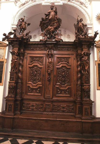 - NOTIZIE STORICO CRITICHE L'armadio fa parte dell'arredo ligneo della prima Sagrestia della basilica di San Martino Vescovo. I Fantoni, chiamati a studiare gli arredi della stanza sulle proporzioni e su un impianto architettonico precostituiti, realizzarono sei "credenzoni", quattro laterali più piccoli e due centrali più grandi. I mobili, iniziati nel 1679 e completati nel giro di un anno, come attesta la data 1680 intagliata sul basamento della prima statua sul primo armadio alla sinistra di chi entra, segnano l'evoluzione della bottega fantoniana dalla maturità del capobottega Grazioso il Vecchio alle opere giovanili dei suoi figli. L'apparato scultoreo dei fastigi segue un programma iconografico, imposto dai canonici della parrocchia, che celebra i fasti della Chiesa attraverso i Trionfi dei principali santi venerati ad Alzano. La ricchezza scultorea del mobile, culminante nell'enfatica gestualità dei tre gruppi sul fastigio, ben si adattano al tema della Chiesa trionfante, richiesto dalla dottrina controriformata.
