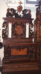 - NOTIZIE STORICO CRITICHE L'inginocchiatoio fu realizzato dalla bottega di Andrea Fantoni tra la fine del 1691 e i primi mesi del 1692, come attestano anche alcuni disegni preparatori. L'opera è in relazione con l'analogo inginocchiatoio, identico nella struttura, addossato alla parete sinistra, anch'esso realizzato dalla bottega di Andrea. Al centro dell'alzata fu inserito l'ovale intagliato nel 1690 ad altorilievo dallo stesso Andrea e dai fratelli Donato, Giambettino e Giovan Antonio come prova di abilità per la Fabbriceria Parrocchiale. Fu proprio con questo esemplare, raffigurante la "Deposizione di Cristo dalla croce", e con altri elementi lignei, che Andrea Fantoni, ormai succeduto al padre a capo della bottega, ottenne nel 1692 il contratto per la realizzazione degli arredi della seconda Sagrestia. Vero e proprio capolavoro, il medaglione presenta chiari riferimenti ad illustri modelli internazionali, come la "Deposizione" dipinta da Charles Le Brun per la cappella di Versailles. L'inginocchiatoio fu completato diversi anni più tardi con l'inserimento della tarsia lignea attribuita tradizionalmente a Giacomo Caniana, noto architetto ma soprattutto abile intarsiatore e restauratore di tarsie lignee. La datazione inzialmente proposta, oscillante tra il 1779 e il 1789, è stata poi anticipata al 1769-1770, in rapporto agli intarsi eseguiti negli stessi anni nei bancali del presbiterio della Cappella Colleoni a Bergamo. Alla Fondazione Fantoni di Rovetta è conservato un disegno preparatorio della tarsia attribuito, seppur con qualche dubbio, allo stesso Caniana. Il modo di trattare le figure, l'atteggiamento enfatico dei personaggi, la costruzione della scena e la stessa modalità di esecuzione, sembrano infatti più vicini allo stile della tradizione fantoniana.
