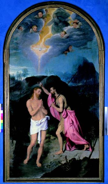 - NOTIZIE STORICO CRITICHE Giovan Battista Moroni, pittore bergamasco famoso soprattutto per i suoi ritratti, fa rivivere l'episodio evangelico del battesimo di Cristo all'interno di una cornice paesaggistica familiare, connatata da riferimenti all'ambiente naturale bergamasco, così come aveva già fatto in altre occasioni. Il dipinto raffigura il momento in cui il Battista asperge Cristo nel fiume Giordano. In lontananza il paesaggio, caratterizzato da un massiccio roccioso e da alcune abitazioni appena abbozzate, si mescola all'azzurro del cielo da cui discende la colomba dello Spirito Santo, perfettamente in asse con la conchiglia usata dal Battista per compiere il rito. Al di sopra, in mezzo a una cortina di nubi da cui fanno capolino degli angioletti, si fa largo in un forte bagliore la figura appena accennata di Dio Padre benedicente. Proprio la fattura del paesaggio, discendente da quello più sfumato e atmosferico inaugurato dal Moroni all'inizio degli anni Sessanta, e la sua progessiva crescita d'importanza in termini di spazio costituiscono due elementi utili alla cronologia dell'opera, collocata intorno al settimo decennio del Cinquecento, non troppo lontano dalla "Deposizione" dell'Accademia Carrara (risalente al 1566). Ciò supporterebbe l'ipotesi che la tela, di cui non si conosce l'originaria collocazione, possa essere stata concepita nel corso dell'aggiornamento figurativo del tempietto di Santa Croce a Bergamo, voluto dal vescovo Federico Cornaro. Lì fu vista dal Pasta (1775) alla fine del Settecento.