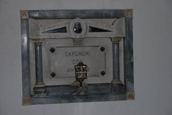 Lastra tombale in forma di edicola rettangolare. Una cornice in marmo grigio inquadra un frontone triangolare concluso agli angoli da motivi fitomorfi e retto da due colonnine a capitello liscio. Al centro è incisa l'iscrizione funebre.
