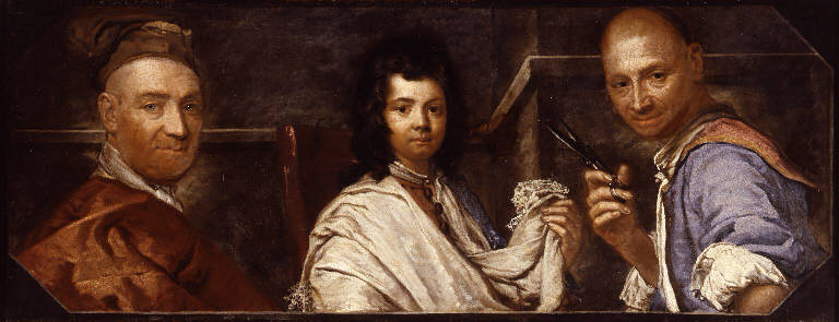 - NOTIZIE STORICO CRITICHE Così descrive Giacomo Carrara: "Un sopraporta con tre tese tra le quali uno con forbice in mano del Ghislandi L. 50.1". E così il Borsetti: "Tre ritratti uniti ovè figurato un parrucchiere detto Oletta ed altro suo lavorante ed un ragazzo di bottega, il già detto Oletta lo conservò con somma diligenza e da tutti era riguardato per uno dei capi d'opera di questo maestro". La cornice risale al XX secolo è ed è costituita da un listello di legno liscio, dorato.