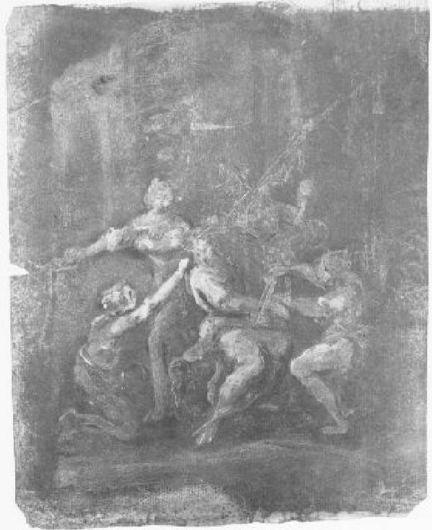 Al centro Gesù Cristo seduto, coronato di spine, volto verso sinistra; attorno a Lui si intravedono cinque carnefici in atto di torturarlo.