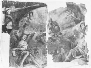 Al centro Dio Padre, tra schiere angeliche, entro la volta celeste; in basso a destra e sinistra anime purganti; in alto due Angeli suonano le trombe del Giudizio.