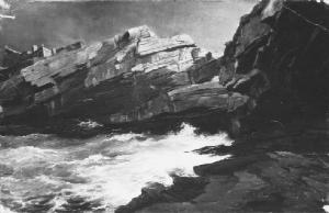 Dalla riva del mare veduta di un'alta scogliera con una rocca a sinistra.