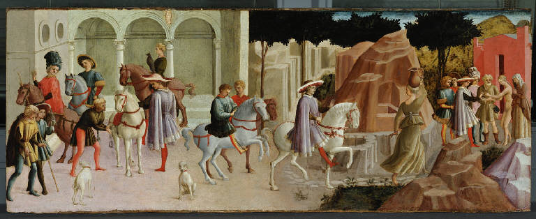 - NOTIZIE STORICO CRITICHE Si tratta probabilmente del pannello laterale del cassone nuziale Gherardi. Oggetti collegati: Gualtieri e i cittadini di Saluzzo. La cornice risale al secolo XX ed è in listello ligneo (liscio) dorato.