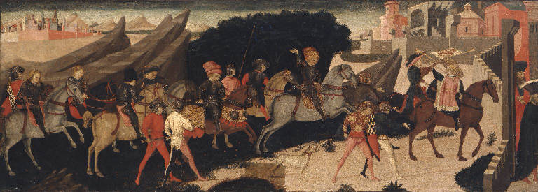 - NOTIZIE STORICO CRITICHE Si tratta del pannello frontale di un cassone nuziale. Copricapo all'orientale: origine orientale dei personaggi (?). La cornice risale al secolo XX ed è in listello ligneo sagomato e dorato. .